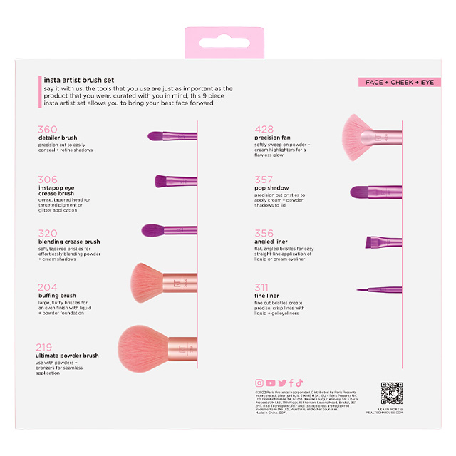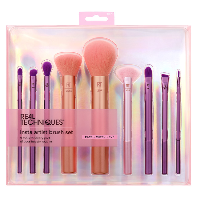 Das Real Techniques Insta Artist Brush Set besteht aus neun essentiellen Pinseln für all Deine Make-up-Bedürfnisse. Unser Insta Artist Brush Set wurde entwickelt, damit Du jede Art von Make-up-Look kreieren kannst, von natürlich bis gewagt. Die Make-up-Pinsel eignen sich am besten für flüssige, cremige und pudrige Produkte, und die meisten von ihnen sind vielseitig verwendbar, was dieses Set perfekt für unterwegs macht. Egal, ob Profi oder ein Anfänger, mit diesem Make-up-Pinselset bist Du bestens ausgestattet. Die Pinsel sind 100% Cruelty Free und bestehen aus UltraPlush-Synthetikborsten.