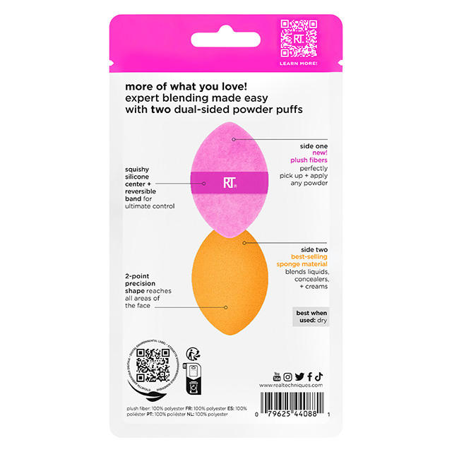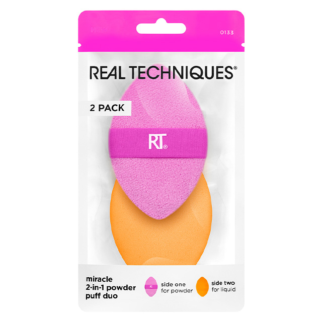 Der Miracle 2-in-1 Powder Puff im Doppelpack: Das Allrounder-Tool ist doppelseitig und wurde für Puder, Flüssigkeiten und Cremes entwickelt. Er wird am besten trocken verwendet. Die rosafarbene Seite besteht aus Plüschfasern, die genau die richtige Menge jedes Puderprodukts aufnehmen. Die orangefarbene Seite besteht aus unserem Miracle Complexion Sponge Material, mit dem sich flüssige oder cremige Produkte mühelos verblenden lassen. Der weiche Silikoneinsatz verleiht dem Powder Puff eine luxuriöse Sprungkraft für das besonders einfache Auftragen.