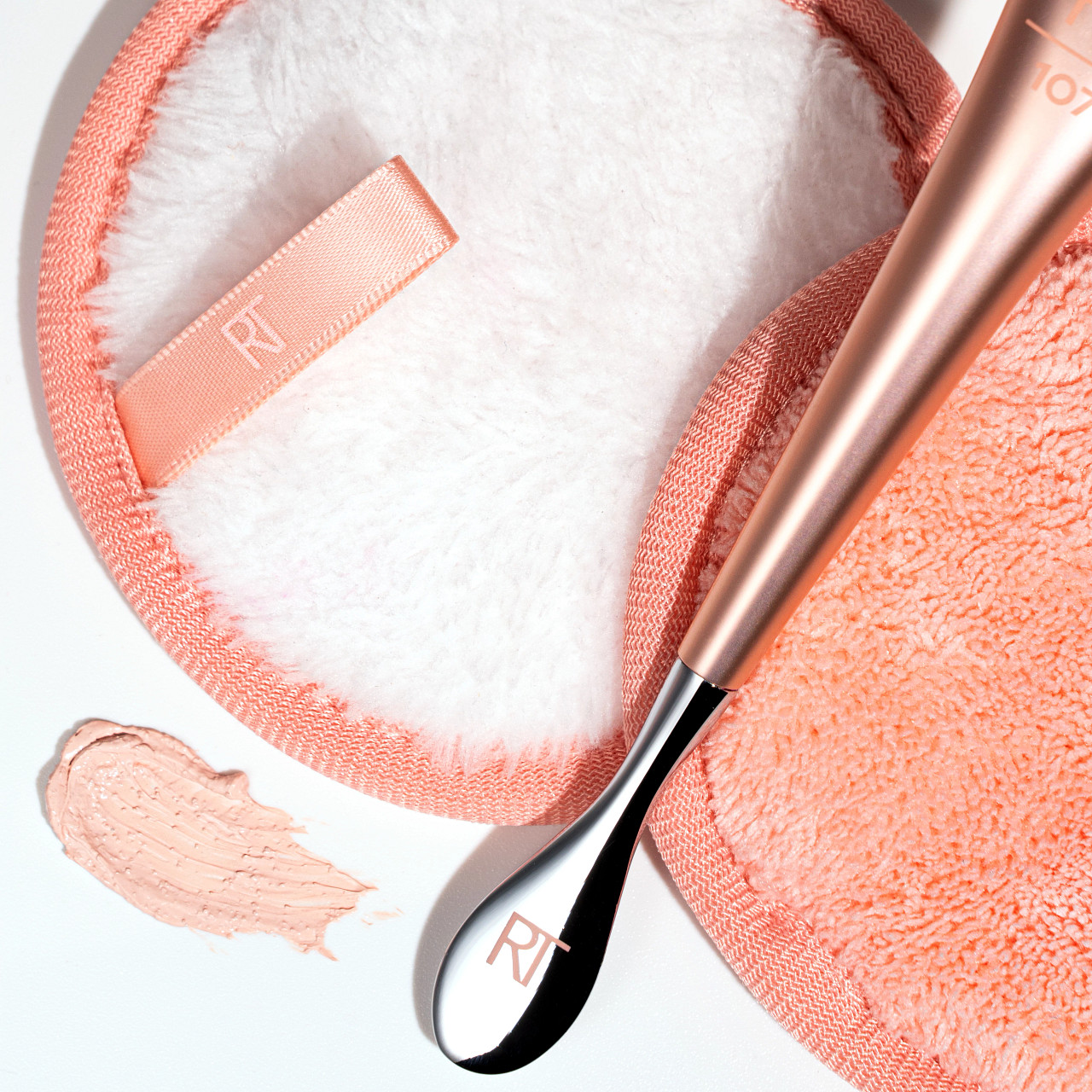 Mit den Real Techniques Make-Up Remover Pads entfernst Du sanft Make-Up, Schmutz und Öl für eine bessere Reinigung. Die Make-Up Remover Pads sind doppelseitig, um eine gezielte Entfernung zu ermöglichen. Die weiße Seite hat eine hochflorige Textur, die das Make-Up sanft entfernt. Die pfirsichfarbene Seite hat eine niedrigflorige Textur, die sich am besten zum reizfreien Entfernen von Augen-Make-Up eignet. Befeuchte das Abschminkpad und massiere es in kreisenden Bewegungen über das Gesicht. Sie können einfach mit Wasser, mit Gesichtsreiniger oder Make-up-Entferner verwendet werden.